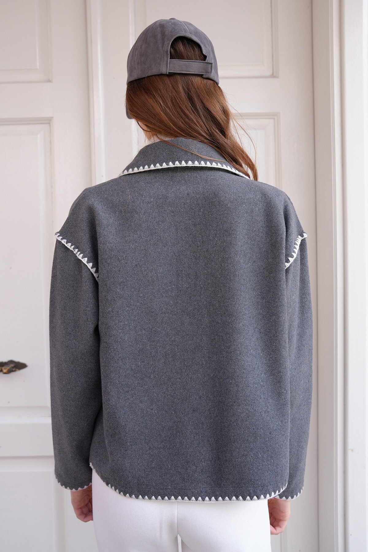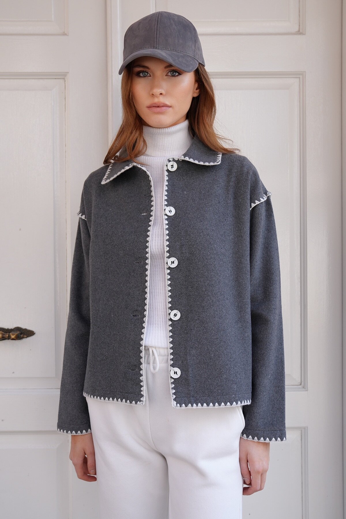 Gömlek Yaka Düğme Kapamalı Kontrast Uzun Kollu Hırka