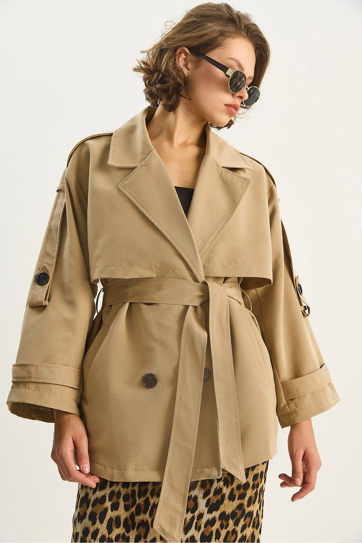 Klasik şıklığı modern kesimle buluşturan bu astarlı kısa trenchcoat, her sezon stilinizi tamamlayacak zamansız bir parça.