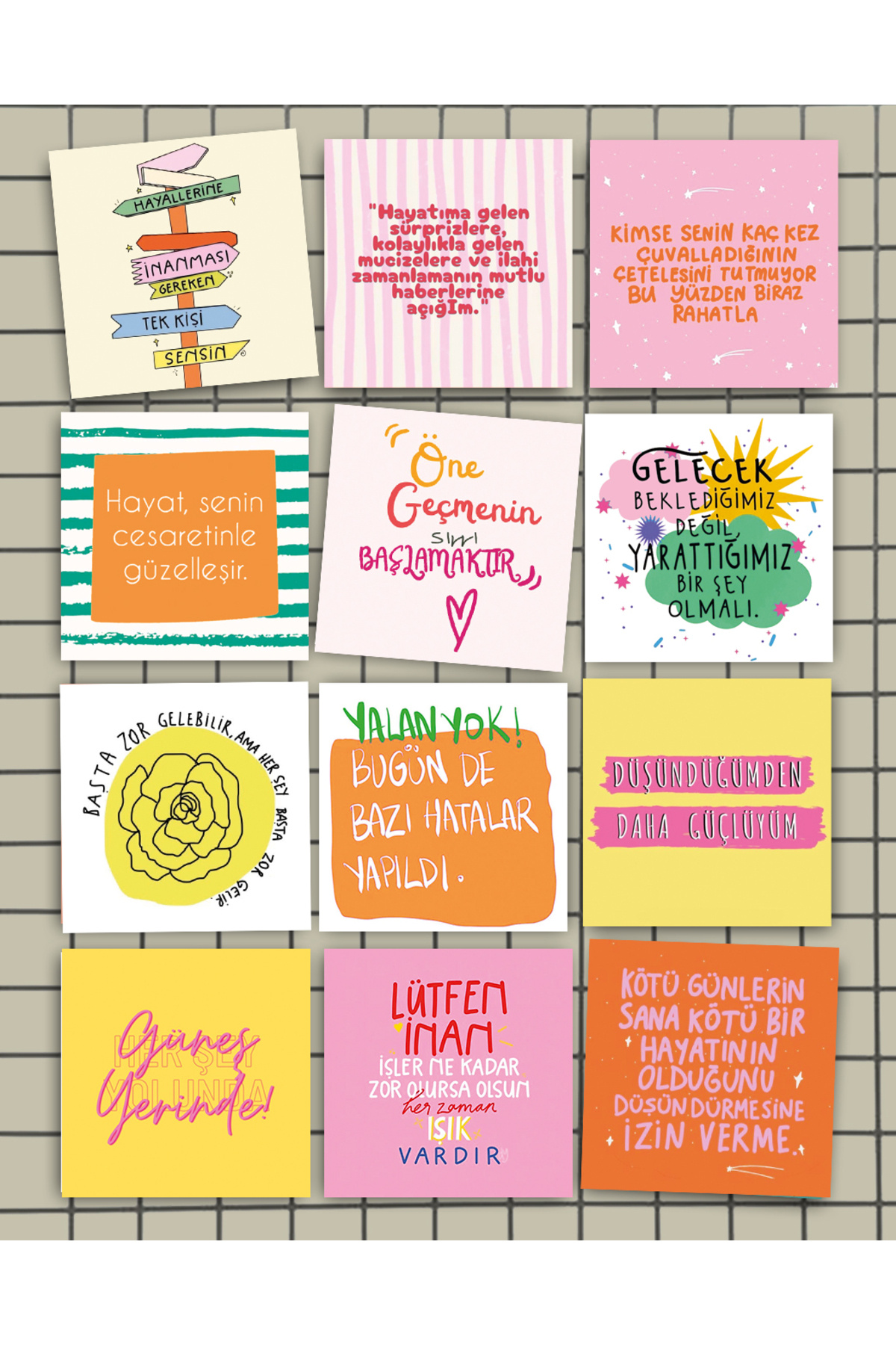 Panolarınız için 12 ADET renkli motivasyon motto sunum kartları Ölçüleri: 10-10cm'dir.