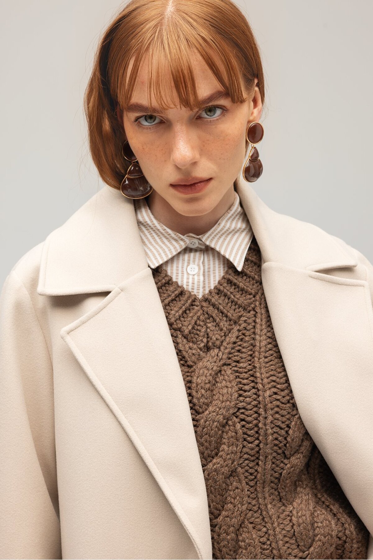 Tek düğmeli kapama detayı, geniş yakaları ve oversize kalıbıyla modern şehir stiline zamansız bir dokunuş katar.