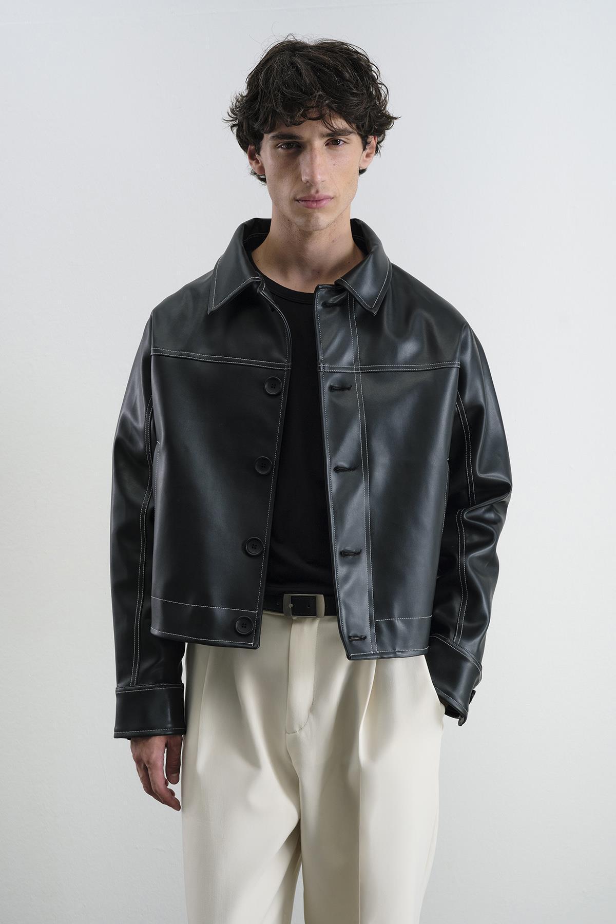 KONTRAST DİKİŞ DETAYLI SİYAH DERİ CEKET
