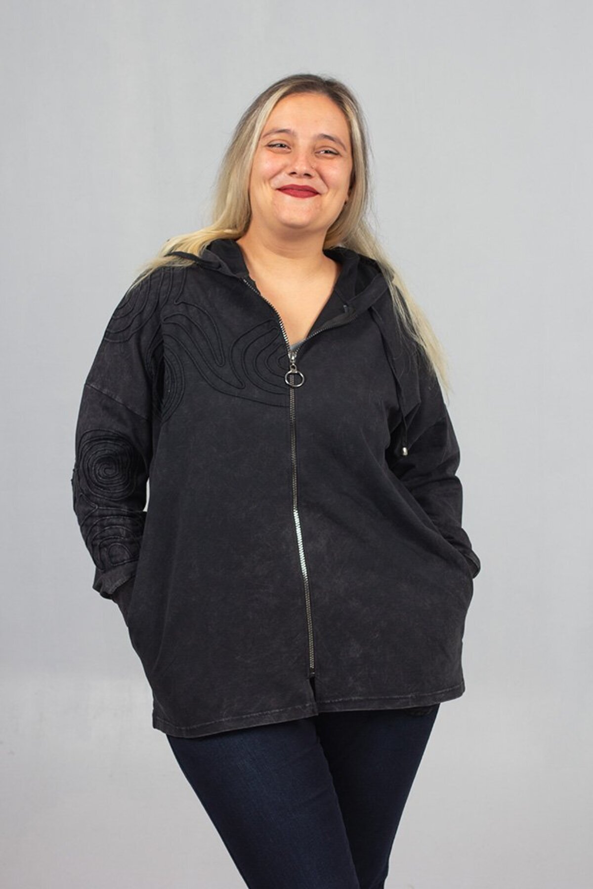 Büyük Beden 2 İplik Pamuk Yıkamalı Siyah Kapşonlu Sweat