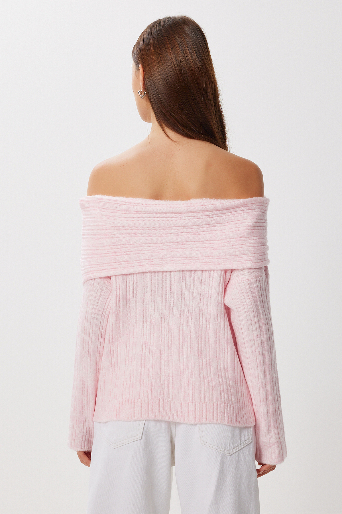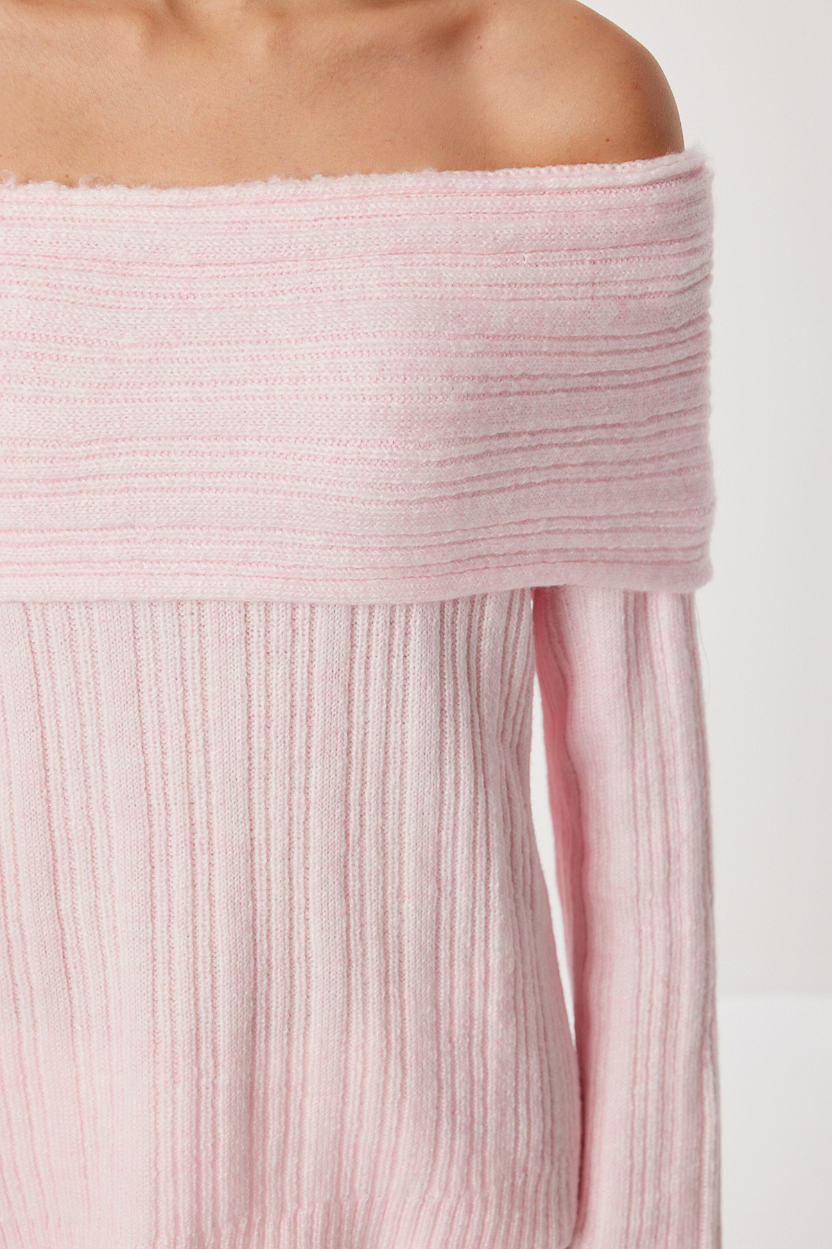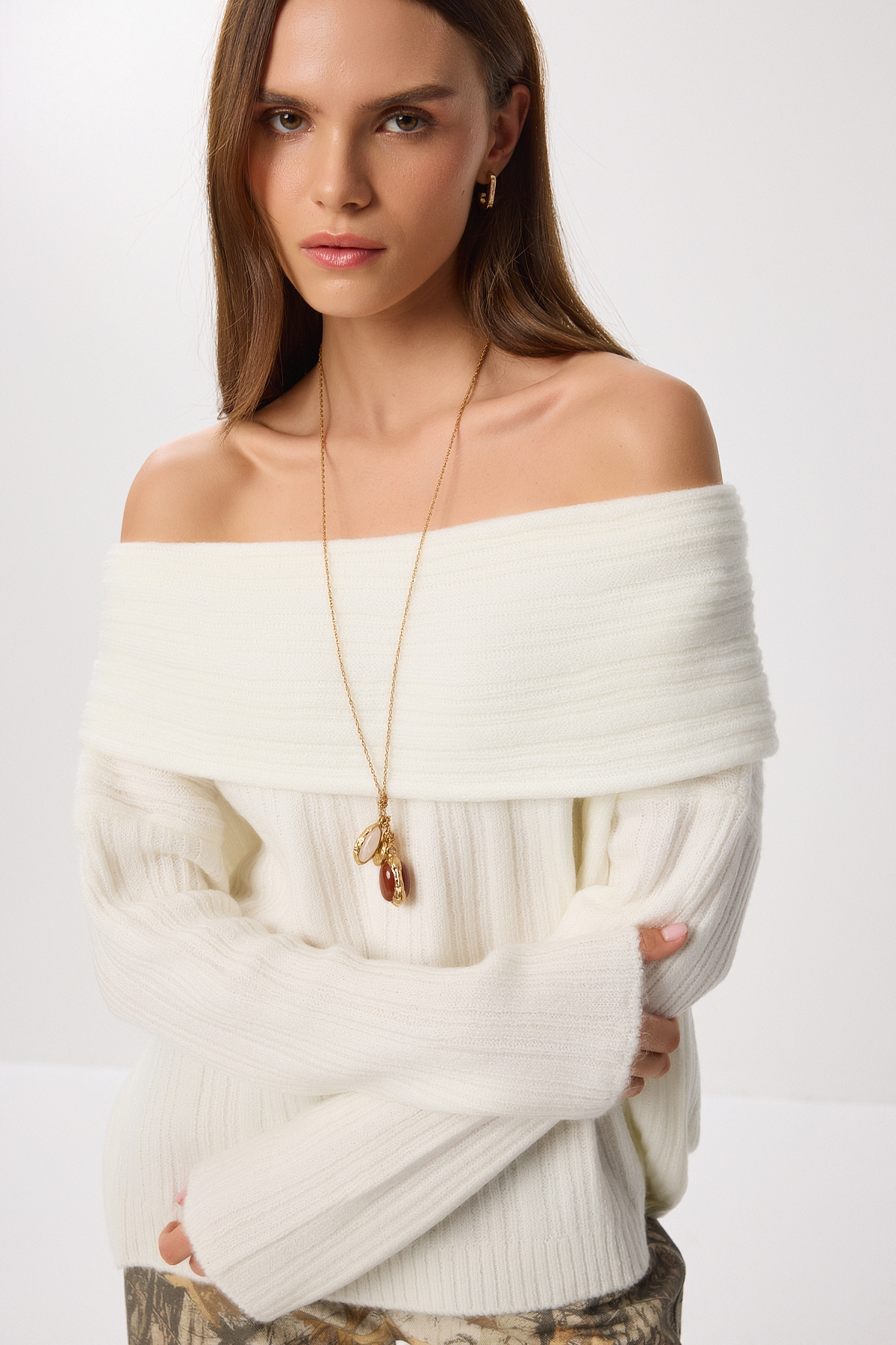 Madonna yaka, düşük omuzlu, esnek yapılı, çizgili triko kazak