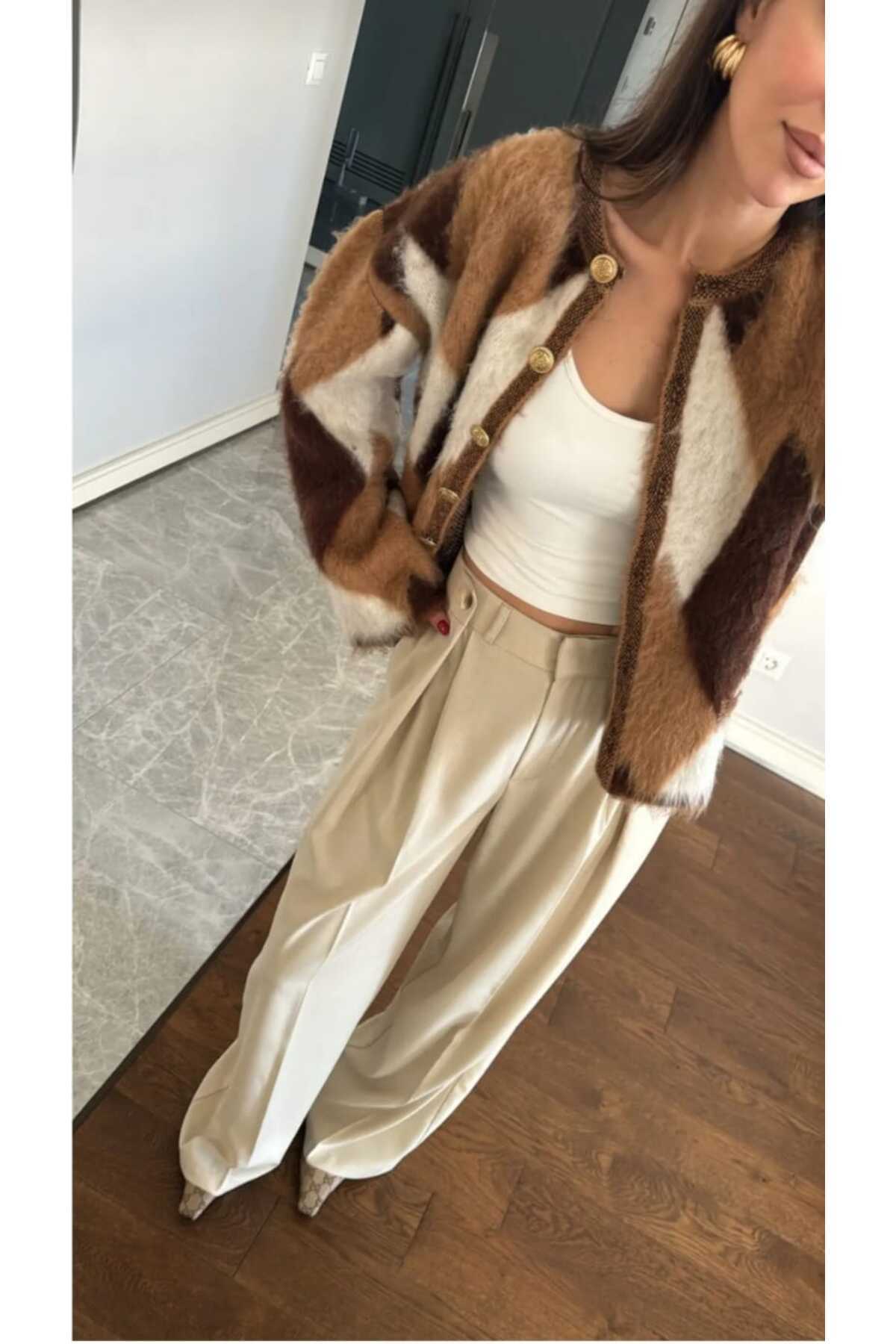 - Baklava desenleriyle süslenmiş, göz alıcı bir görünüm sunan kadın triko hırka.