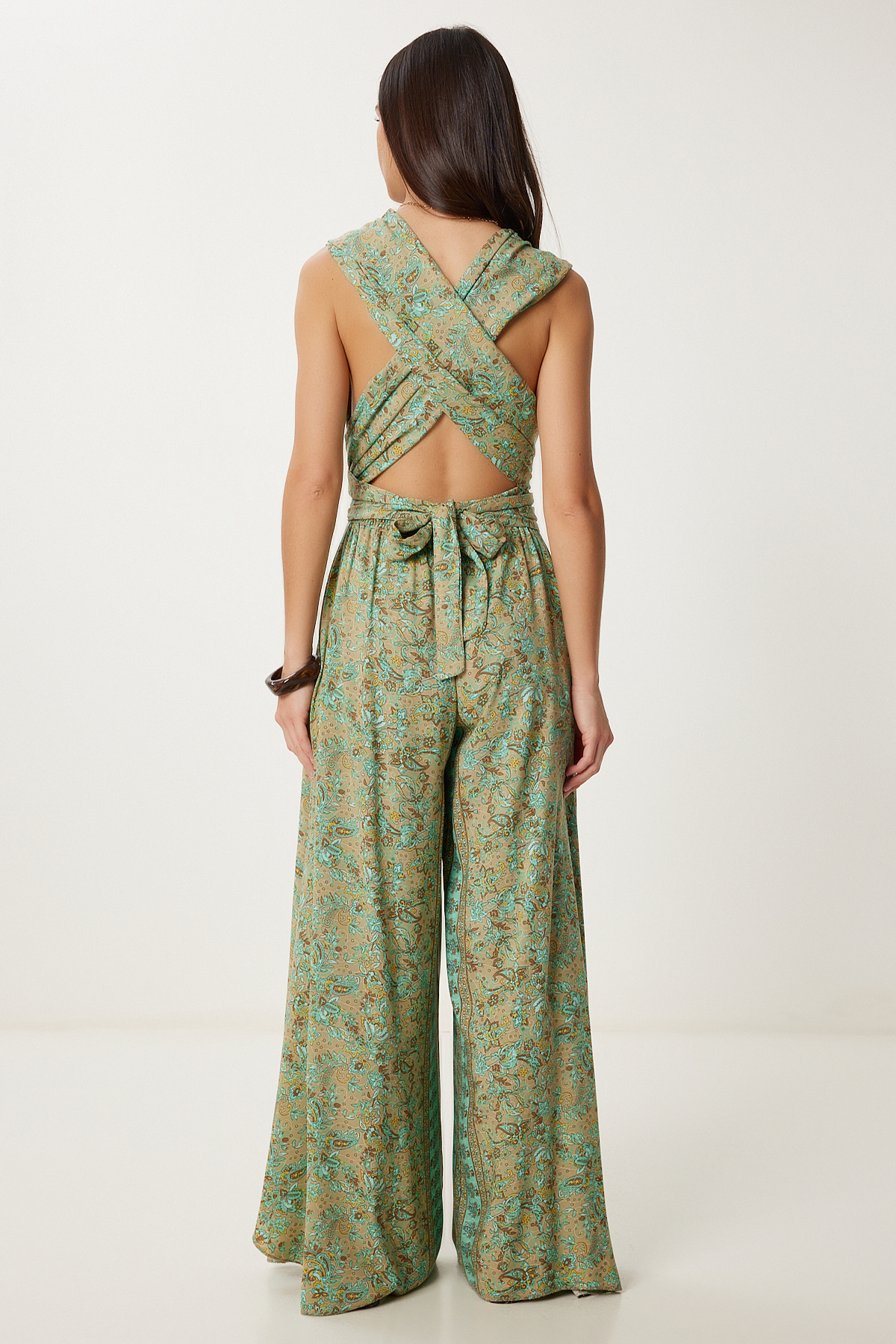 Boyundan bağlamalı, v yaka, sırtı lastikli, volanlı desenli viskon tulum