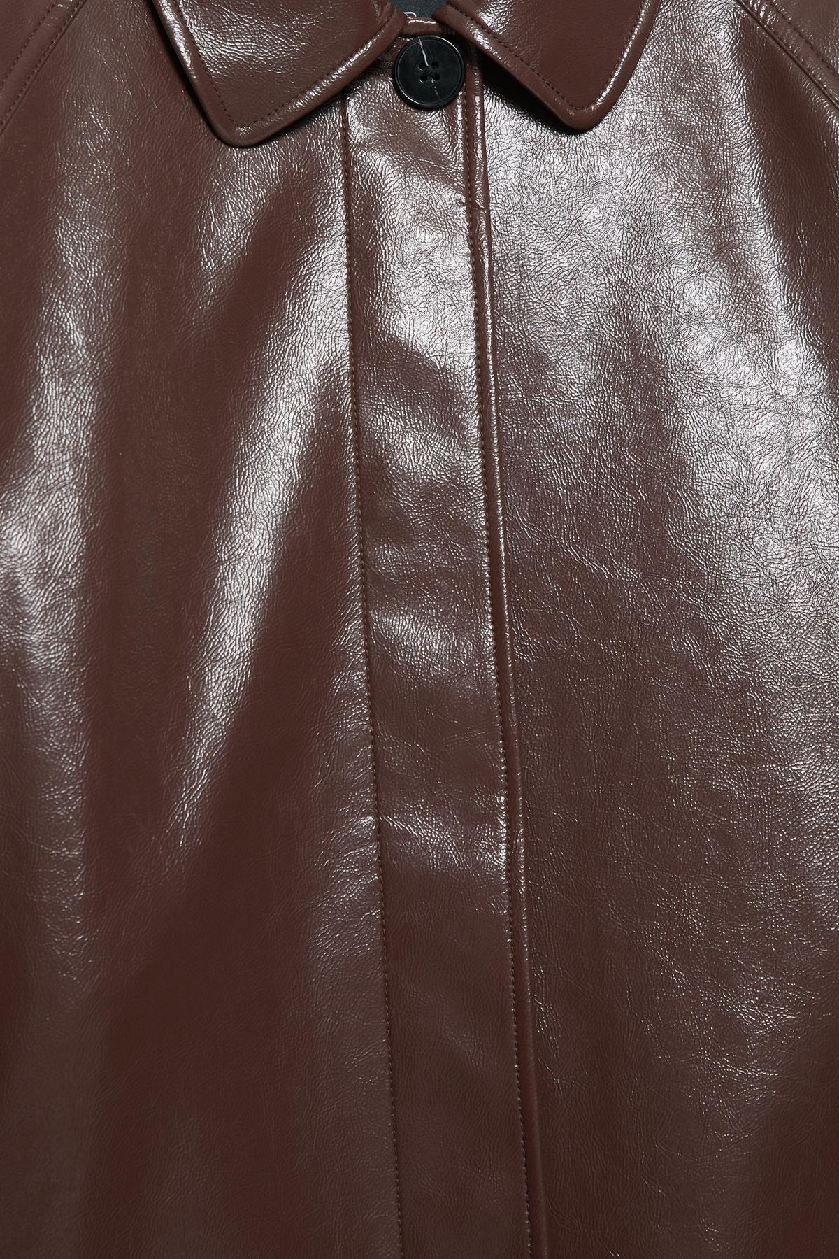 Vinil görünümlü kumaş trençkot, gömlek yaka, yan cepler ve düğme kapama.