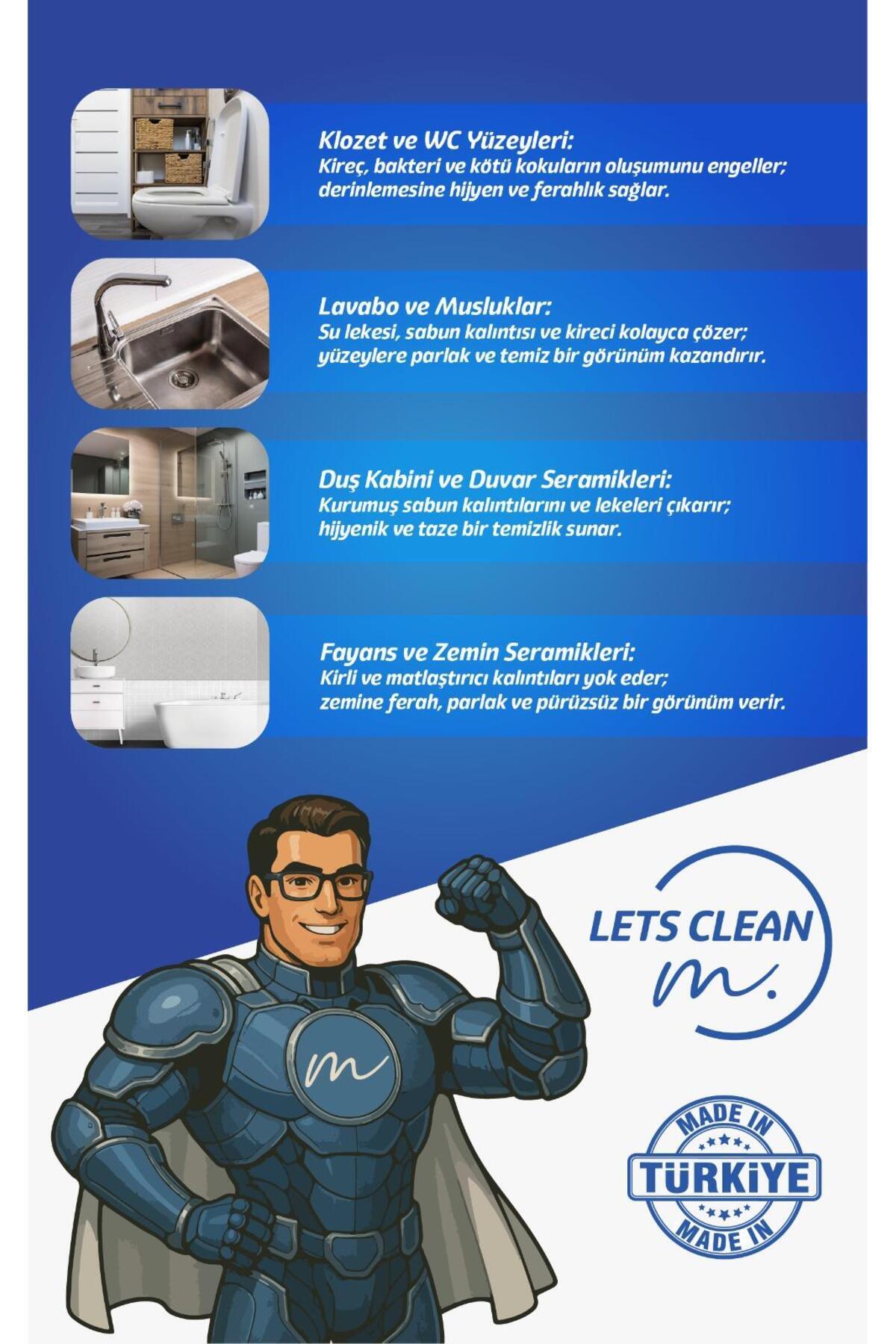 Fayans, seramik, lavabo, duşakabin ve klozet gibi yüzeylerde güvenle kullanılır, yüzeylere zarar vermeden parlaklık kazandırır.