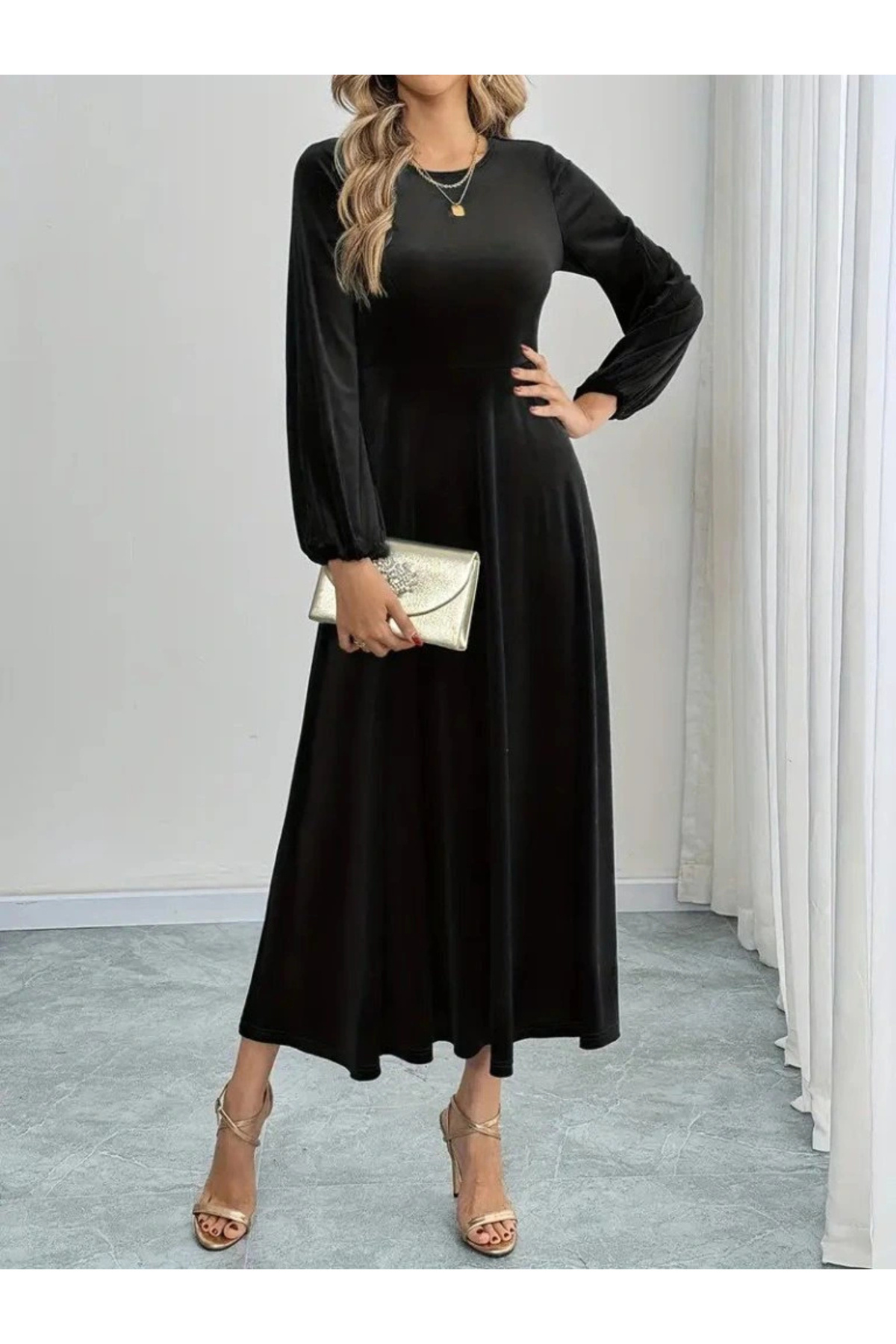 • Kadın Uzun Kollu Bisiklet Yaka Midi Kadife Elbise