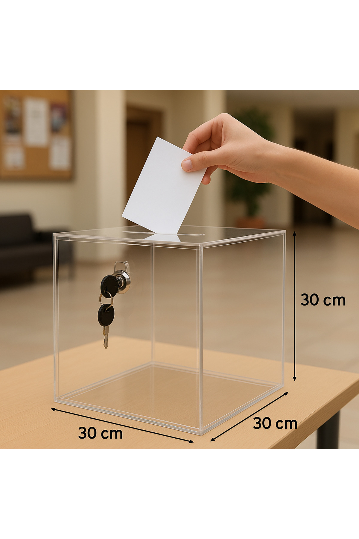 - Bağış ve sadaka kutusu olarak kullanıma uygun, 30x30x30 cm boyutlarındaki bu pleksi kutu, hem şıklığı hem de fonksiyonelliği bir arada sunar.