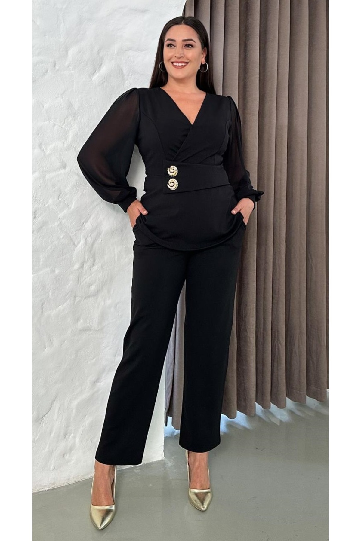 - Kruvaze yaka tasarımı ile modern ve sofistike bir stil oluşturulmuştur.